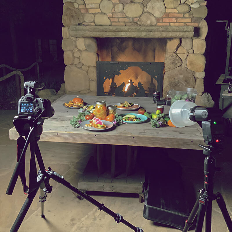 Behind the scenes with these tasty dishes and a simple setup using a camera on tripod, hot light, and off camera flash.